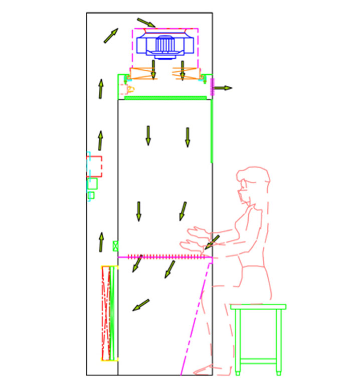 稱(chēng)量亭潔凈氣流被送至送風(fēng)箱體內(nèi),90%通過(guò)均流送風(fēng)網(wǎng)板,形成均勻的垂直送風(fēng)氣流,10%則通過(guò)風(fēng)量調(diào)節(jié)板,排出設(shè)備。所有氣流均經(jīng)過(guò)高效過(guò)濾器處理,所以送風(fēng),排風(fēng)均不帶殘余粉塵,避免了二次污染。
